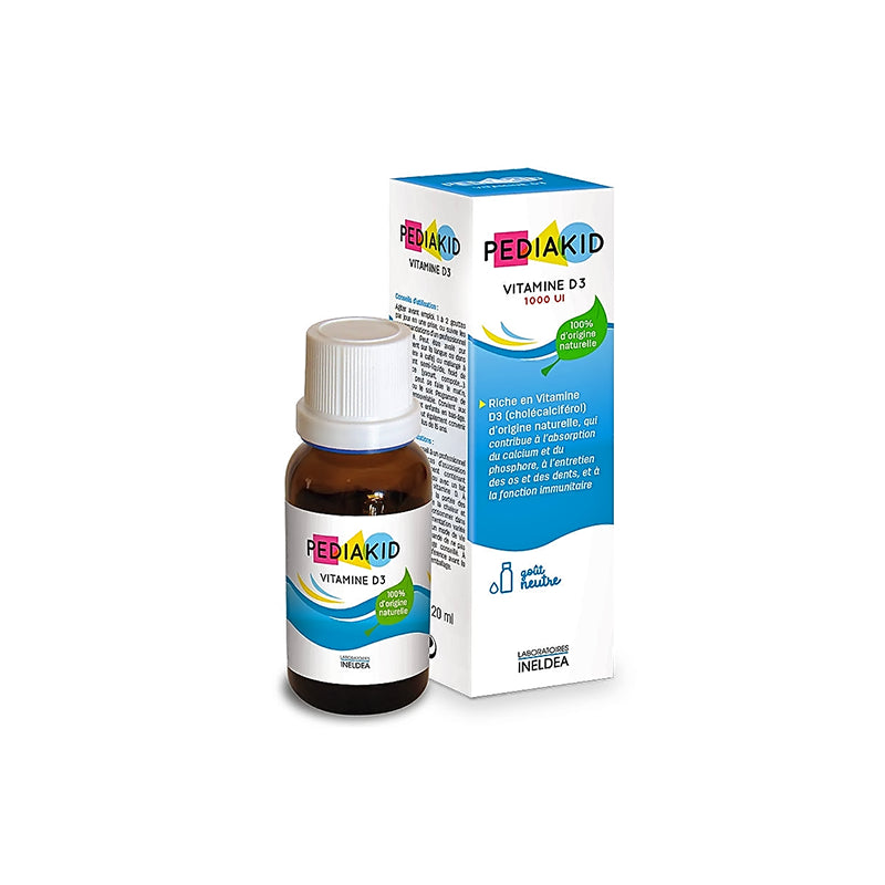 Pediakid Vitamin D3 drops is rich in Vitamin D3 from natural origin, which improves overall health in children, and help in the absorption of calcium and phosphorus, maintaining bones and teeth, supporting normal function of the immune system, normal cell division and normal muscle function.